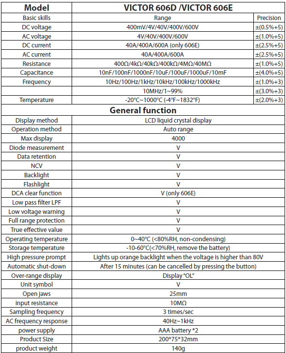 This test meter is a handheld automatic range digital clamp meter which driven by battery. The clamp multimeter can be used to measure such parameters as DCV, ACV, ACA, Resistance, Continuity Buzzer, Diode, Frequency, Temperature, etc. This LCD Digital AC/DC clamp multimeter is a portable and professional clamp meter which has almost everything you need for a full multimeter. Digital clamp meter is widely used for field, laboratory, shop and home applications
