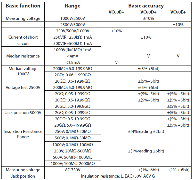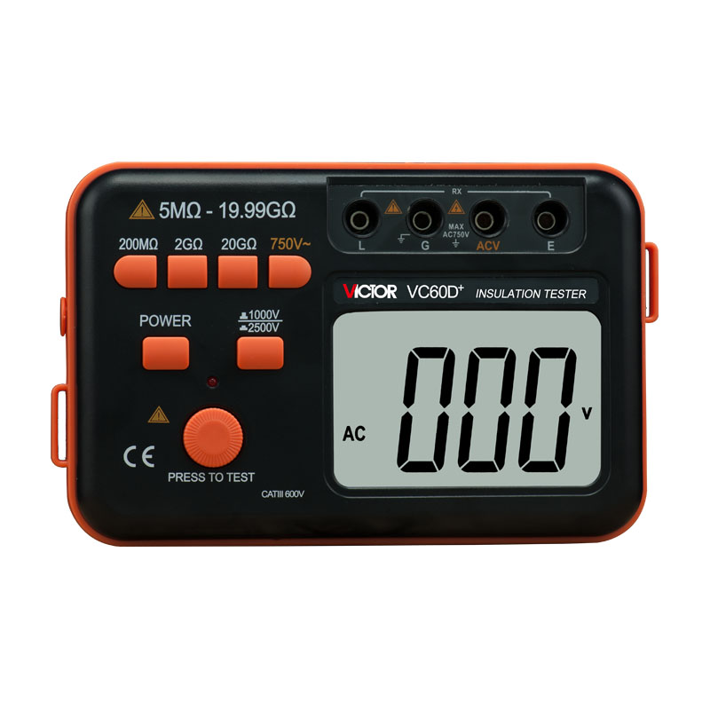 This instrument adopts the DC Voltage convertor of low consumption and high converter ratio inductance energy storage, to change the 9V Voltage to 250V/500V/1000V (VC60B+) 1000V/2500V (VC60D+), 2500V/5000V (VC60E+) DC Voltage. It uses digital bridge to make the insulation resistance measurement had the features of user-friendly, high extent range, backlight display, data hold and auto power off. The whole instrument is stylish and superior grade in appearance and high stable in performance, it can be operated by both hands through using a shoulder strap. It is most suitable for the needs of insulation resistance check, such as electric, cable, electrical and mechanical equipment, telecommunication equipment and electrical facilities