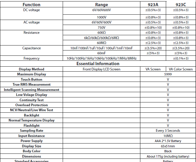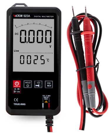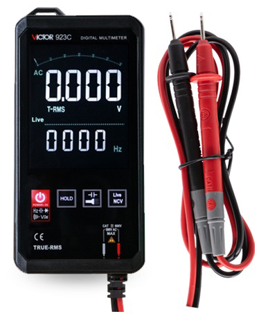 The VICTOR 923 series is a variety of pocket-sized 3 5/6-digit true RMS intelligent scanning digital meters; this series has triple displays: main display, secondary display, and analog bar. The function can be adjusted according to the input AC and DC voltage/resistance. Automatic identification and measurement, allows the machine to have stable performance, high precision, high reliability, clear readings and overload protection function. Driven by AAA 1.5V battery, this series of meters adopts VA super color screen LCD display and adopts boost power supply. Even at the edge of 2.3V low battery. This series of instruments can be manually switched to measure DC voltage and AC voltage, resistance, capacitance, frequency, electric field, live wire determination, and can also be manually switched to measure capacitance, diode, continuity test, and other parameters. It is a tool instrument with superior performance. It is an ideal tool for laboratories, factories, radio enthusiasts and families.