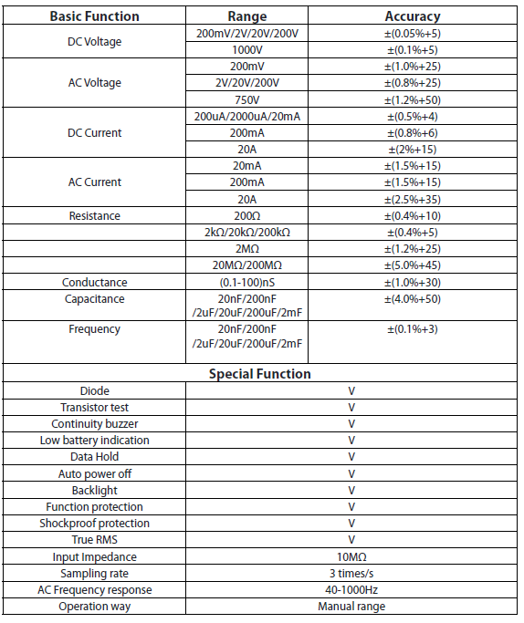 True RMS, LED Flashlight, Auto power-off(15 minutes no operation auto power-off), Diode test, On-off test(buzzer and light), Temperature C/F, Low voltage display, Keeping Data, Cathode display, Sampling frequency (2 times/s), anti-drop rubber sleeve, Input impedance(10MΩ), Protection against burn (<250V 600mA/20A)